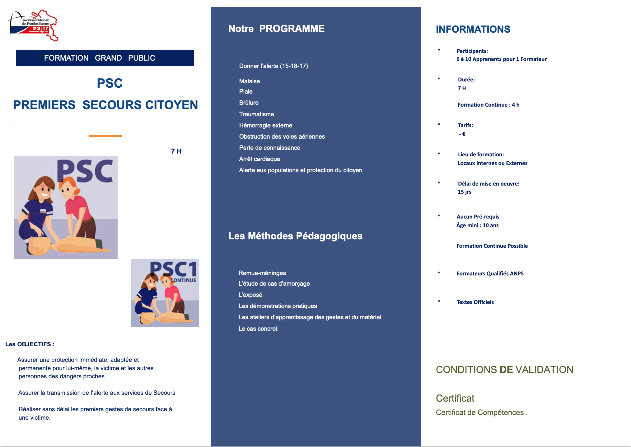 Cette aptitude à secourir est sanctionnée par un certificat de compétences de Premiers Secours Citoyen conforme à l’arrêté du 15 juin 2024 relatif à la filière citoyenne de sécurité civile et en application des référentiels internes de formation et de certification de l’ANPS validés par la Direction Générale de la Sécurité Civile et de la Gestion des Crises.